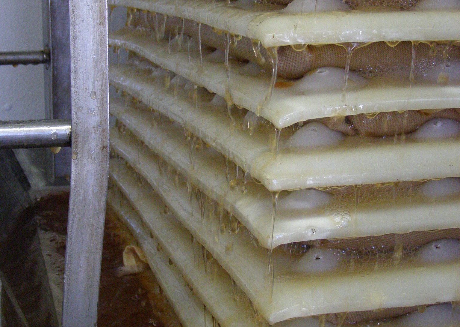 This ground apple mash is carefully pumped into racking cloths, which are layered to form a full “rack” ready for pressing. Once the rack is built, it’s placed in the press, where it’s squeezed to release every drop of golden cider.